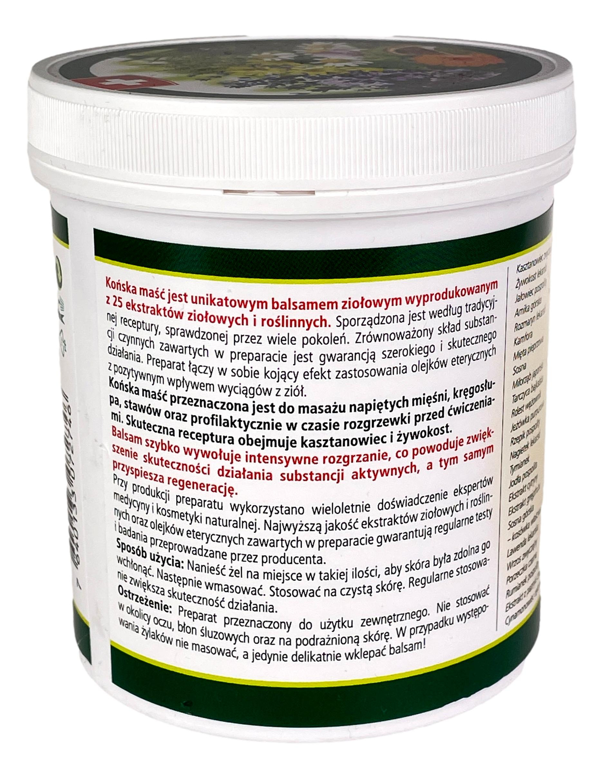 Końska maść rozgrzewająca 150 ml to produkt sporządzony z 25 starannie dobranych ziół i ekstraktów ziołowych. Balsam ma działanie kojące i rozgrzewa mięśnie, dzięki czemu można pozbyć się dokuczliwego bólu.