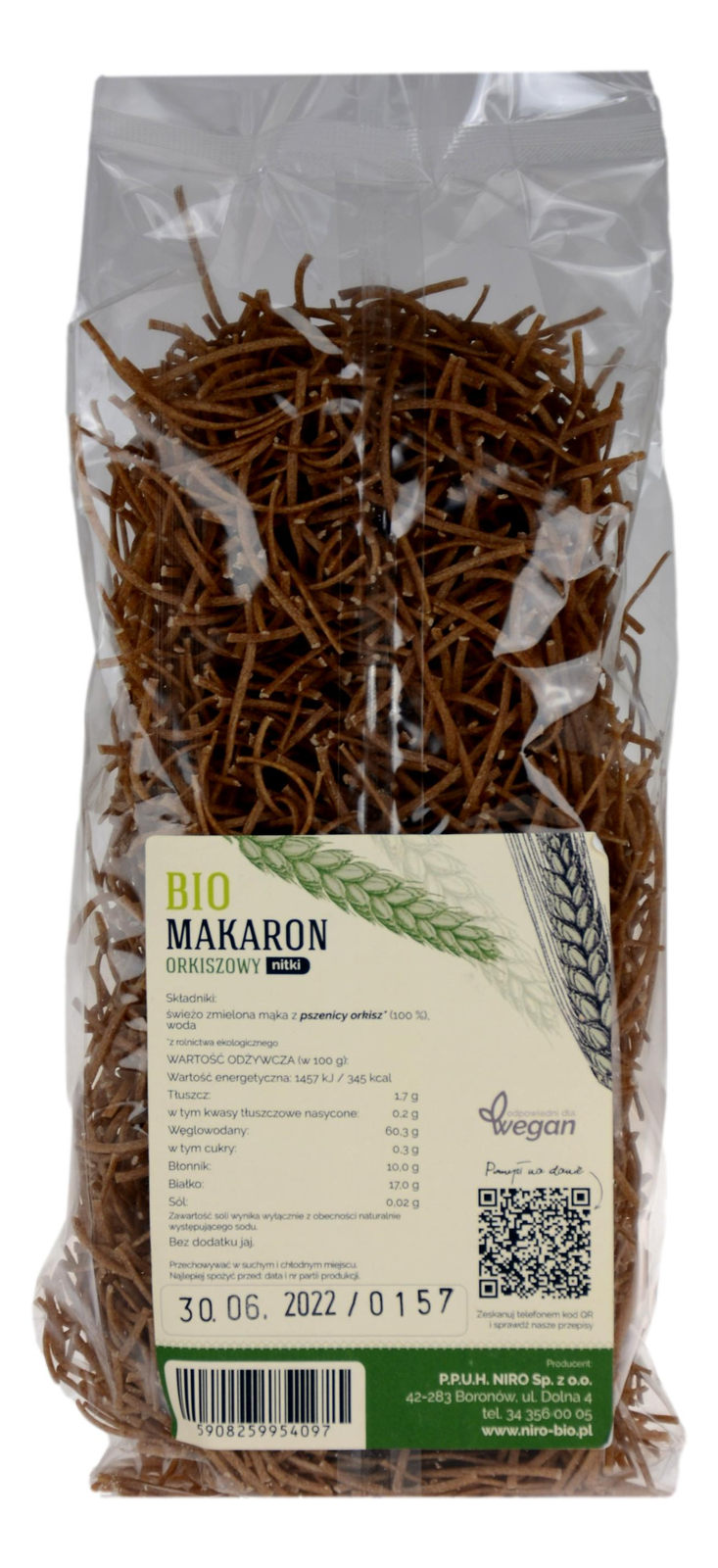 Makaron orkiszowy pełnoziarnisty nitki BIO 400g NIRO