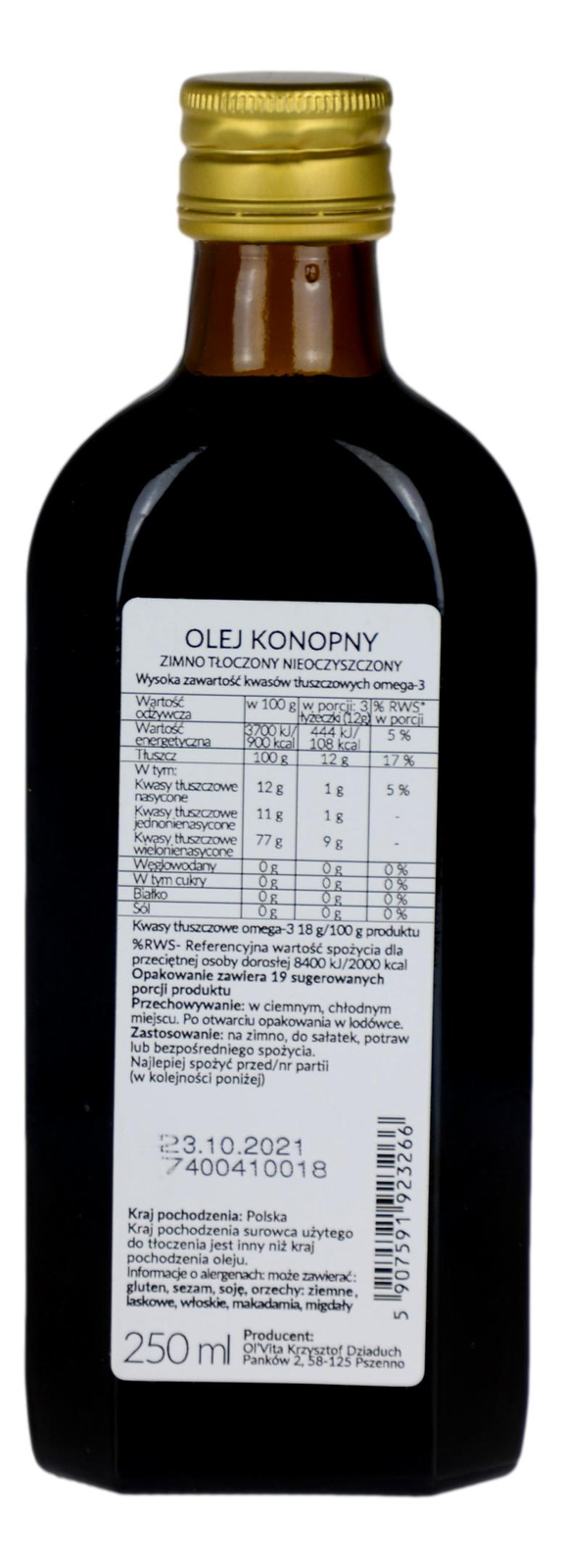 Olej konopny zimnotłoczony, nieoczyszczony, nierafinowany