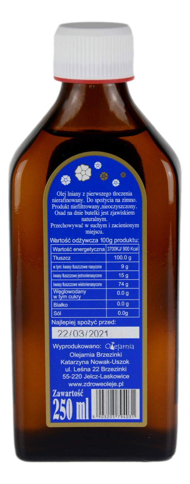 Olej lniany budwigowy tłoczony na zimno 250ml OLEJARNIA