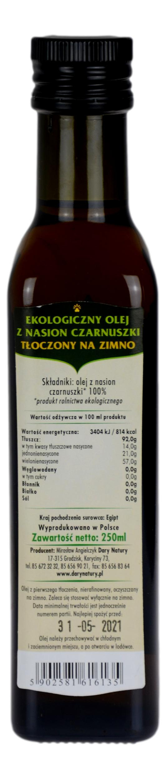 Ekologiczny, tłoczony na zimno olej z czarnuszki z rośliny Nigella Sativa jest używany od wieków. Nasiona czarnuszki zawierają ponad 100 cennych składników odżywczych, w tym znaczne proporcje białka, węglowodanów i niezbędnych kwasów tłuszczowych, które są budulcem komórek. Aktywnymi składnikami czarnuszki są Nigellone, Thymoquinone i Thymol. Nasiona czarnuszki zawierają również kwas linolowy, kwas oleinowy, wapń, potas, żelazo, cynk, magnez, selen, witaminę A, witaminę B, witaminę B2, niacynę i witaminę C. Olej z nasion czarnuszki pozyskiwany jest w 100% z wyselekcjonowanych nasion pochodzących z ekologicznych upraw, zachowując najwyższe standardy podczas zbioru. Olej jest następnie ekstrahowany jednokrotnie w technologii tłoczenia na zimno. Zapewnia to najwyższą jakość extra virgin, wolną od jakichkolwiek dodatków i konserwantów.