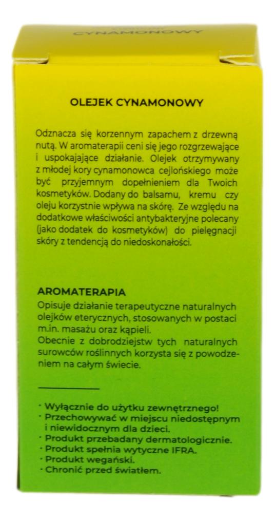 Odznacza się korzennym zapachem z drzewną nutą. W aromaterapii ceni się jego rozgrzewające i uspokajające działanie. Olejek otrzymywany z młodej kory cynamonowca cejlońskiego może być przyjemnym dopełnieniem dla Twoich kosmetyków. Dodany do balsamu, kremu czy oleju korzystnie wpływa na skórę. Ze względu na dodatkowe właściwości antybakteryjne polecany (jako dodatek do kosmetyków) do pielęgnacji skóry z tendencją do niedoskonałości.