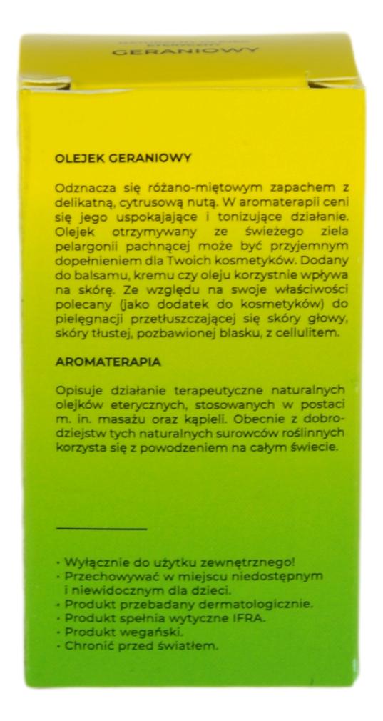 Odznacza się różano-miętowym zapachem z delikatną, cytrusową nutą. W aromaterapii ceni się jego uspokajające i tonizujące działanie. Olejek otrzymywany ze świeżego ziela pelargonii pachnącej może być przyjemnym dopełnieniem dla Twoich kosmetyków. Dodany do balsamu, kremu czy oleju korzystnie wpływa na skórę. Ze względu na swoje właściwości polecany (jako dodatek do kosmetyków) do pielęgnacji przetłuszczającej się skóry głowy, skóry tłustej, pozbawionej blasku, z cellulitem.