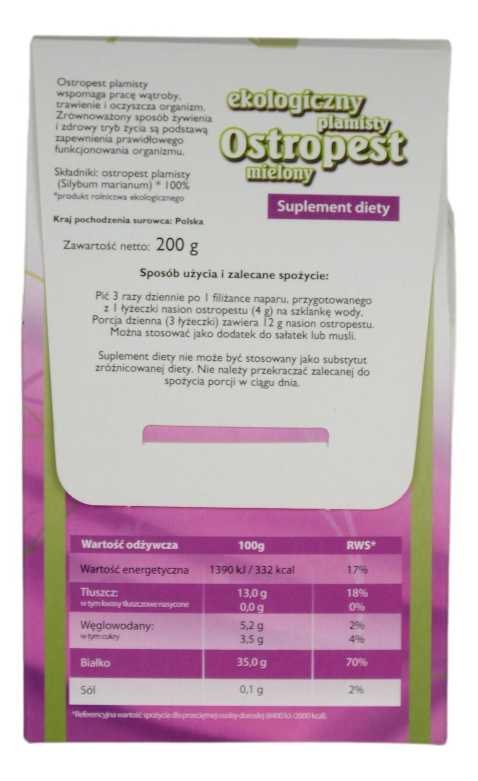 Nasiona ostropestu najlepiej zmielić, rozbić lub zmiażdżyć. Pić 3 razy dziennie po 1 filiżance naparu, przygotowanego z 1 łyżeczki nasion ostropestu (4g) na szklankę wody. Porcja dzienna (3 łyżeczki) zawiera 12 g nasion ostropestu. Można stosować jako dodatek do sałatek lub musli. Suplement diety nie może być stosowany jako substytut zróżnicowanej diety. Nie należy przekraczać zalecanej do spożycia porcji w ciągu dnia.