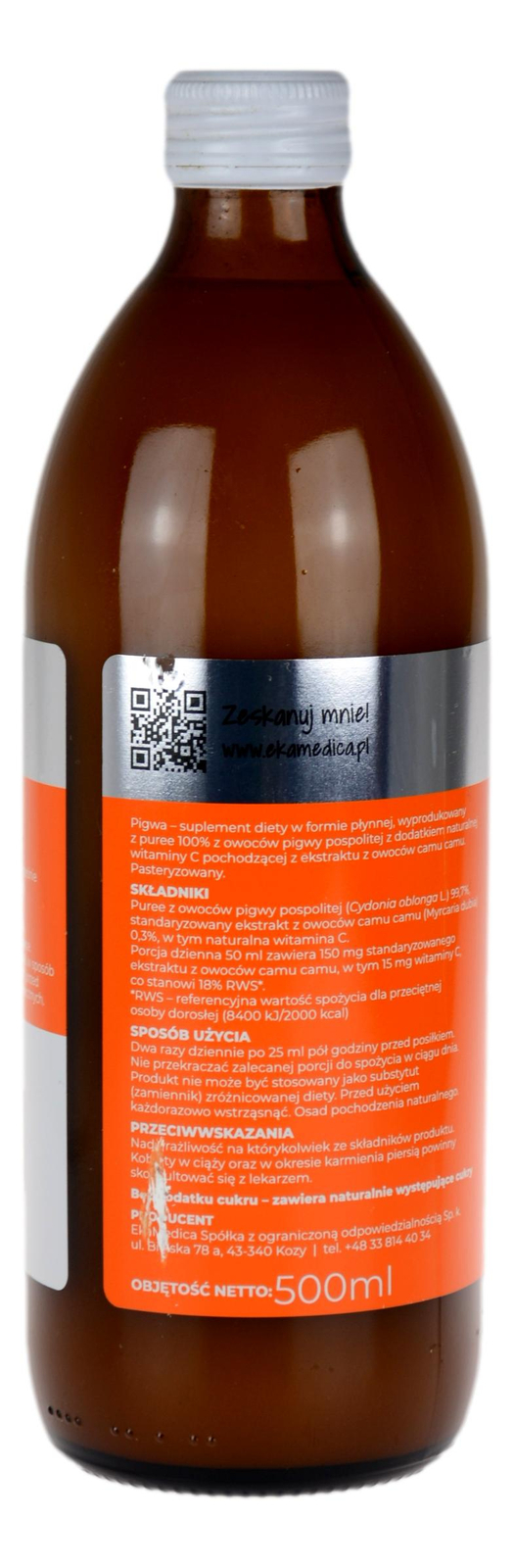 Suplement diety w formie płynnej, wyprodukowany z puree 100% z owoców pigwy pospolitej z dodatkiem naturalnej witaminy C pochodzącej z ekstraktu z owoców camu camu.