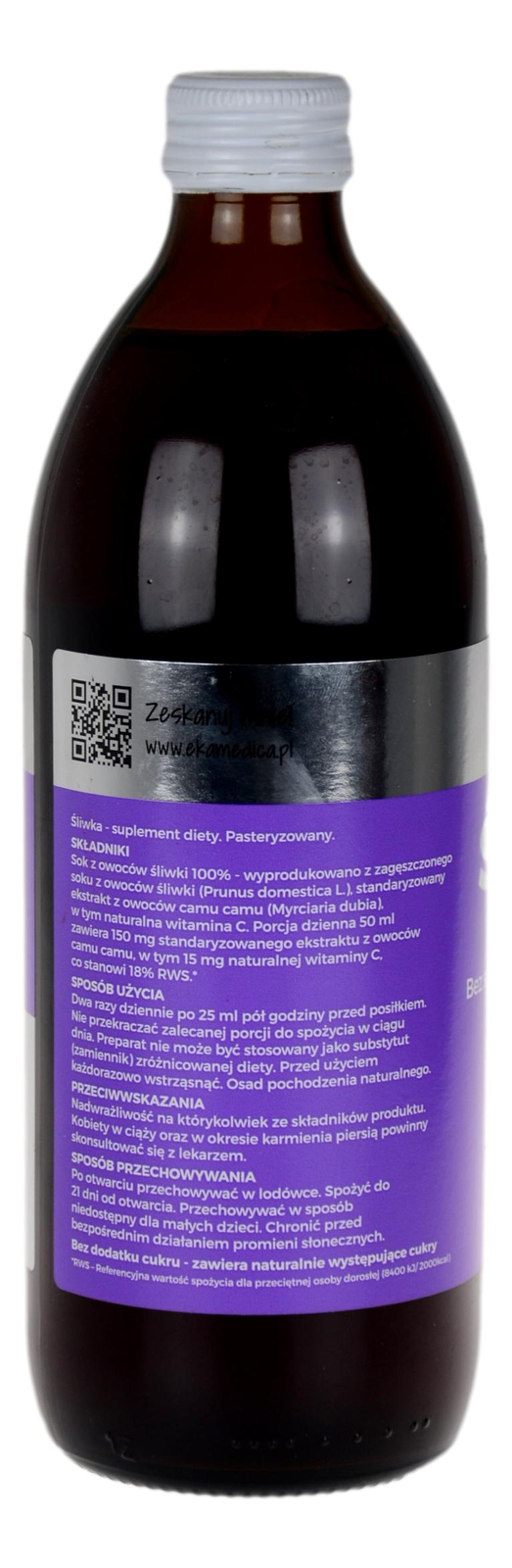 Sok z owoców śliwki 100% - wyprodukowano z zagęszczonego soku z owoców śliwki (Prunus domestica L.), standaryzowany ekstrakt z owoców camu camu (Myrciaria dubia), w tym naturalna witamina C.