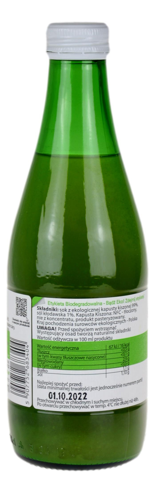 Sok z ekologicznej kapusty kiszonej jest bogaty w witaminę C, potas i wapń oraz wspomaga cały układ trawienny. Z dodatkiem ekologicznego czosnku oraz szczypty soli.