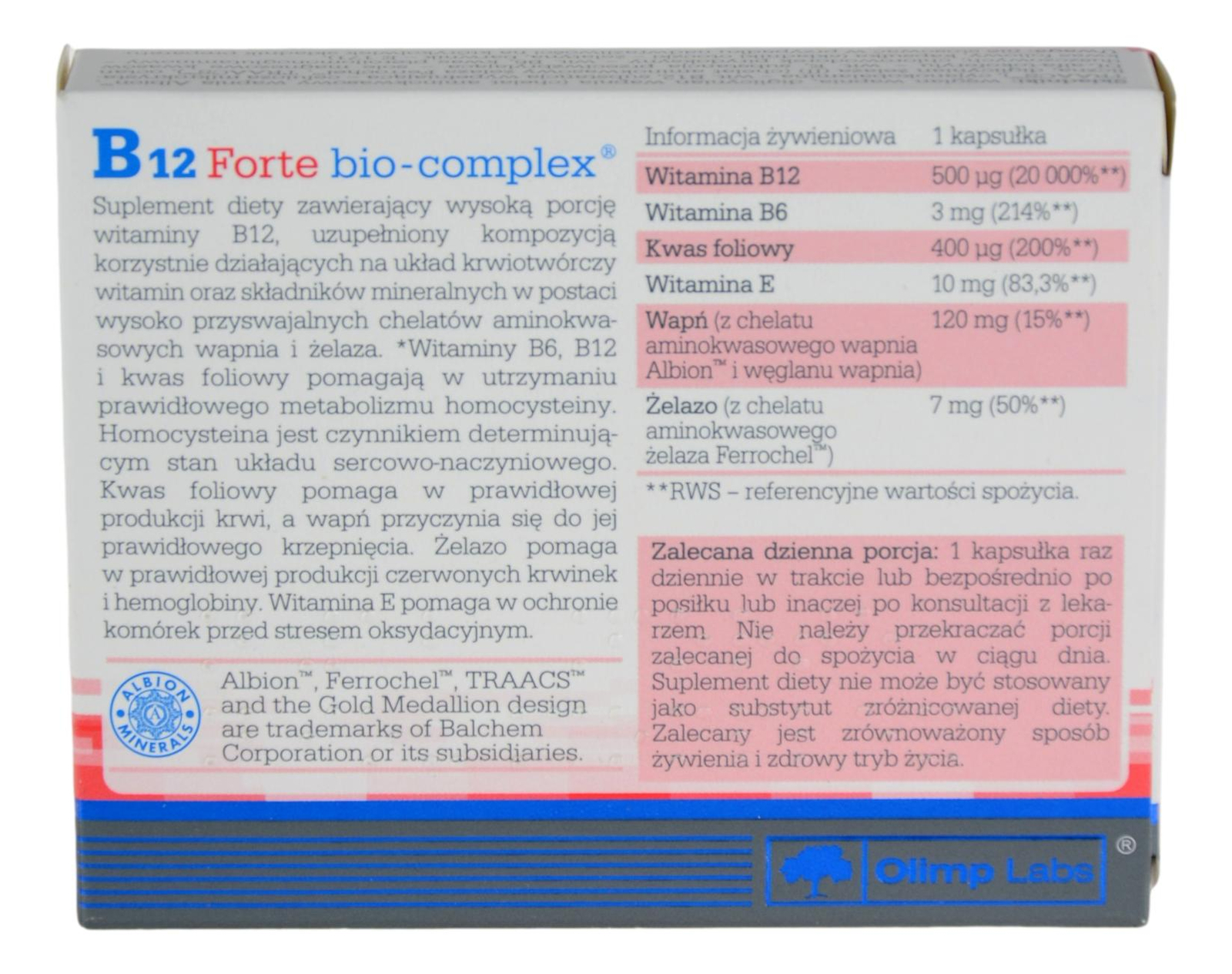 B12 FORTE bio–complex to suplement diety zawierający wysoką dawkę witaminę B12, uzupełniony kompozycją korzystnie działających na układ krwiotwórczy witamin i składników mineralnych, w tym wysoko przyswajalnych chelatów aminokwasowych wapnia i żelaza. Witaminy B12, B6 i kwas foliowy pomagają w utrzymaniu prawidłowego metabolizmu homocysteiny. Homocysteina jest czynnikiem determinującym stan układu sercowo-naczyniowego. Kwas foliowy pomaga w prawidłowej produkcji krwi a wapń przyczynia się do jej prawidłowego krzepnięcia. Żelazo pomaga w prawidłowej produkcji czerwonych krwinek i hemoglobiny. Witamina E pomaga w ochronie komórek przed stresem oksydacyjnym.